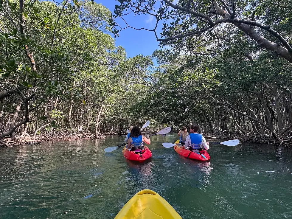 The adventure continues as you transition from boat to kayak and paddle into the mangrove tunnels. Here, the bay feels completely different—quiet, shaded, and full of life. Kayaking through the mangroves allows you to explore narrow waterways that boats can’t reach, offering an up-close look at this vital coastal habitat.